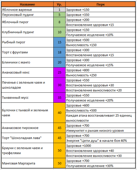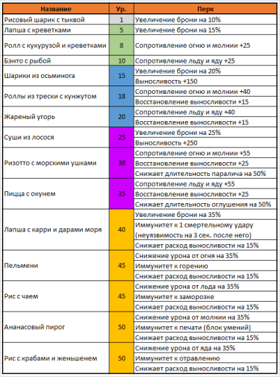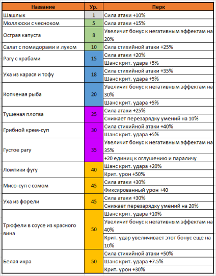 Ниже вся информация по блюдам и необходимым уровням навыка "гастроном" для изучения каждого рецепта.